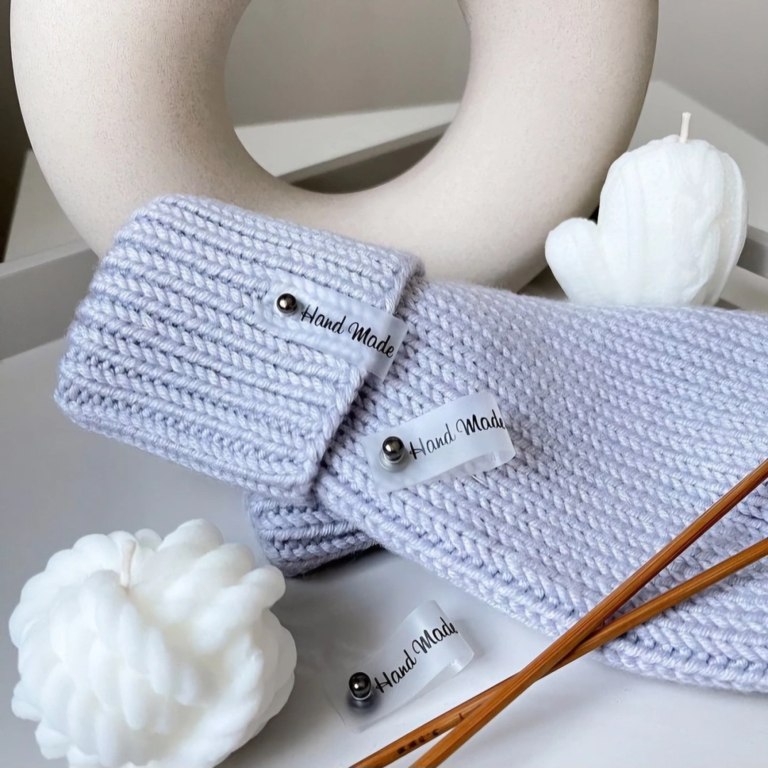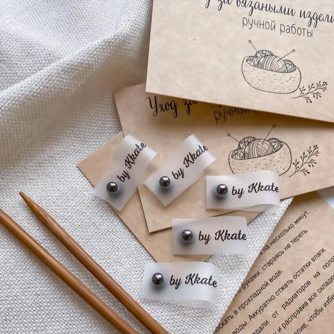 Силиконовые бирки мягкие, пластичные, полупрозрачные и приятные на ощупь. Это эластичный материал, который долго держит форму. Такая бирка будет интересно смотреться на изделиях не перегружая его. Силиконовые бирки на кобурной кнопке отлично подойдут для вязанных изделий: головные уборы, джемпера, варежки. Такие бирки используют в качестве именных или как составники/размерники.