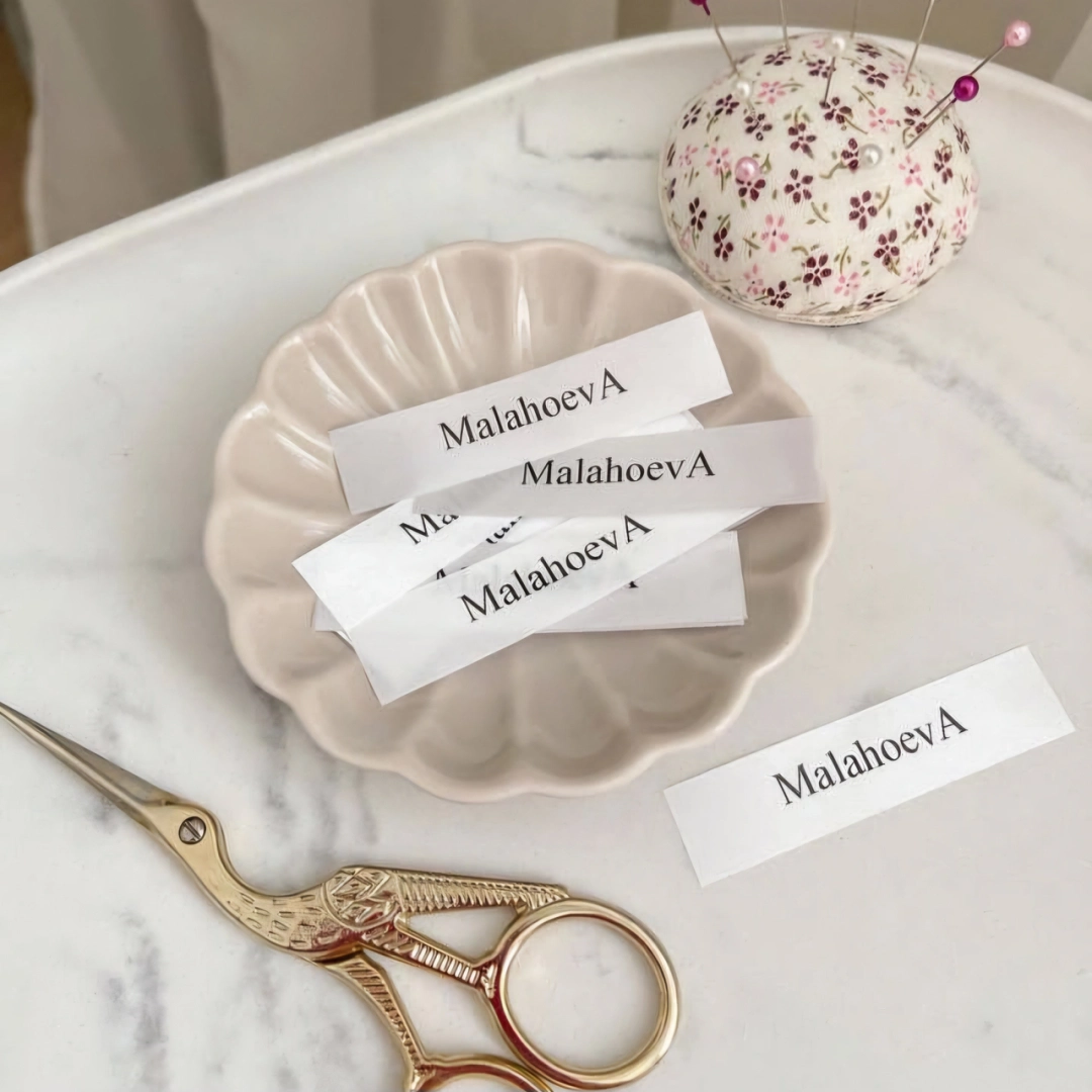 Сатиновые бирки – это самый популярный выбор, благодаря сочной печати и износоустойчивости. Они пластичные и мягкие на ощупь. Бирки из сатина можно использовать на внешней и внутренней стороне изделия в качестве именных бирок и составников/размерников. Они универсальны и подходят для всех видов изделий.